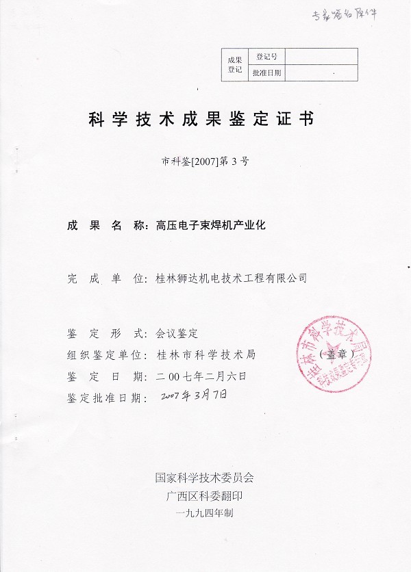 高壓電子束焊機產(chǎn)業(yè)化成果證書