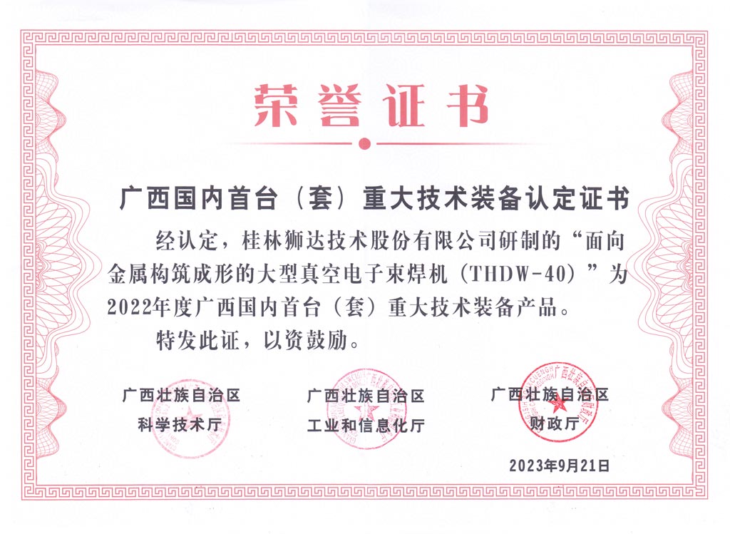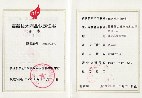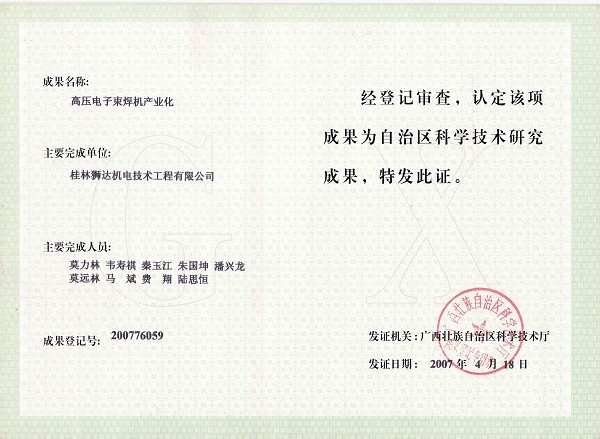 高壓電子束焊機產(chǎn)業(yè)化成果證書